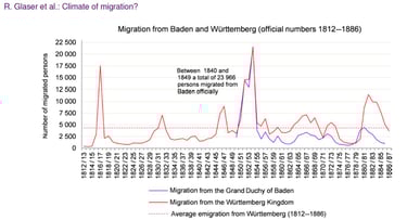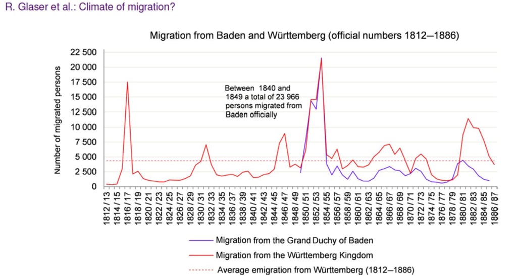 The Little Ice Age was coming to an end. With its coldest periods seeing major glacial advances and many extreme weather events spanning the 1400s to 1850s. A study in the Climate of the Past Journal, reviews the evidence that climate was a significant driver of migration from Southwest Germany to North America in the 19th Century. This video from the European Geosciences Union gives a short summary: